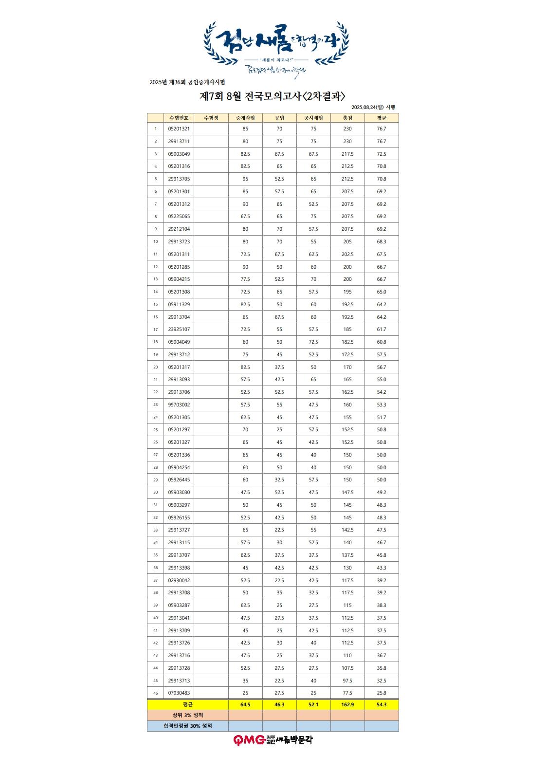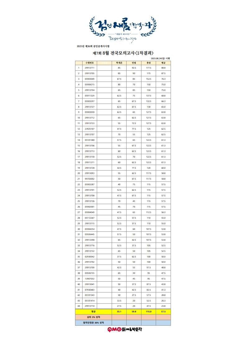 <8월 박문각 전국모의고사 결과>📌1차■ 학개론 : 평균 55.1 점 (최고 : 85점)■ 민 법 : 평균 59.8 점 (최고 : 92.5점)📌2차■ 중개사법 : 평균 64.5 점 (최고 : 95점)■ 공 법 : 평균 46.3 점 (최고 : 75점)■ 공시세법 : 평균 52.1 점 (최고 : 75점)