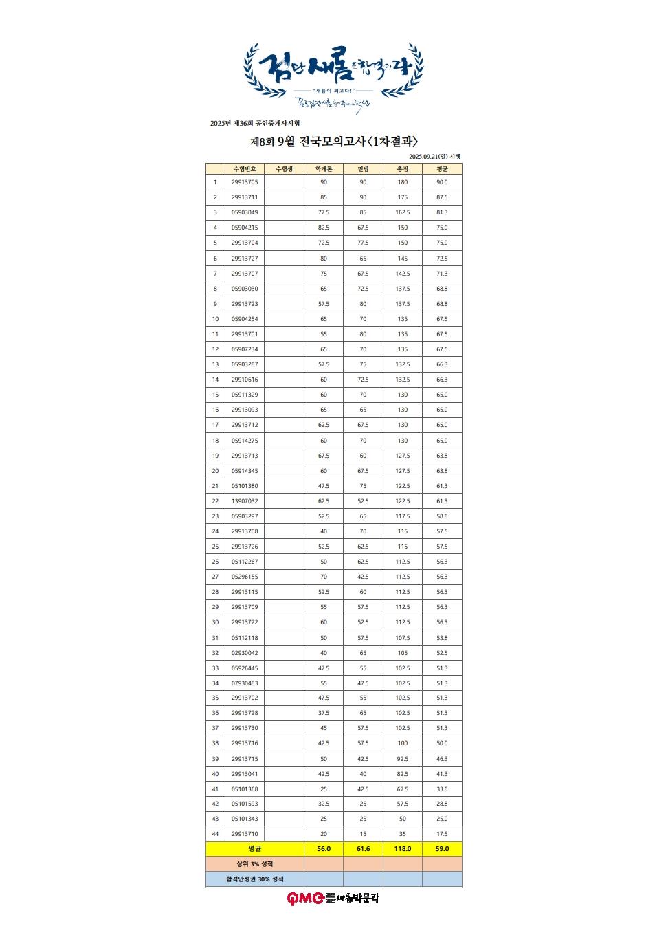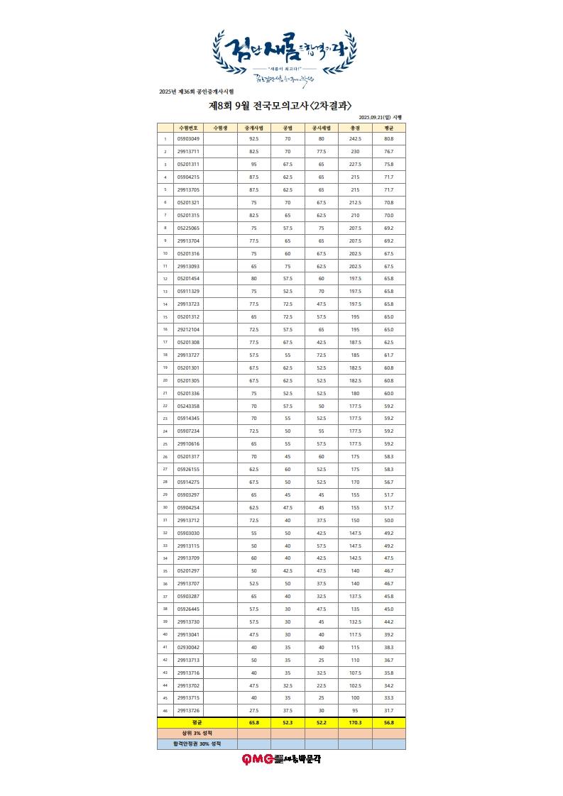 <9월 박문각 전국모의고사 결과>📌1차■ 학개론 : 평균 56.0 점 (최고 : 90점)■ 민 법 : 평균 61.6 점 (최고 : 90점)📌2차■ 중개사법 : 평균 65.8점 (최고 : 95점)■ 공 법 : 평균 52.3점 (최고 : 75점)■ 공시세법 : 평균 52.2점 (최고 : 80점)